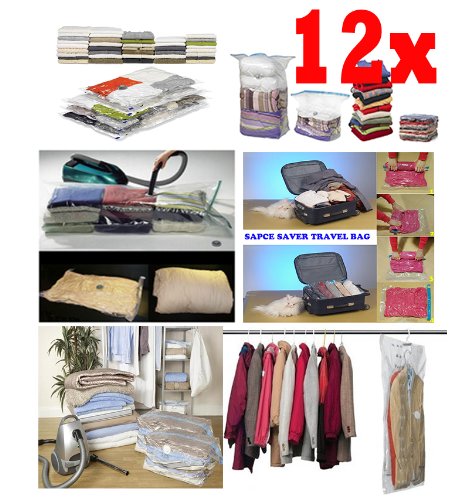 Triple your storage space, protect your valuables and stay organized with this value pack. •Suit case size Carry On roll up travel bags bags size measure 17.75" X 23.6" - 5 Bags •Medium Vacuum Bags measure 20" X 27.5" - 1 Bag •Large Vacuum Bags measure 35.5" X 27.5" - 1 Bag •XL Vacuum Bags measure 43.5" X 27.5" - 1 Bag •Jumbo Vacuum Bags measure 51" X 40" - 1 Bag •Hanger Vacuum Bags measure 51" X 27.5" - 1 Bag •XL Vacuum Cube Bags measure 32" X 16" X 40" - 2 Bags•Total 12 Bags