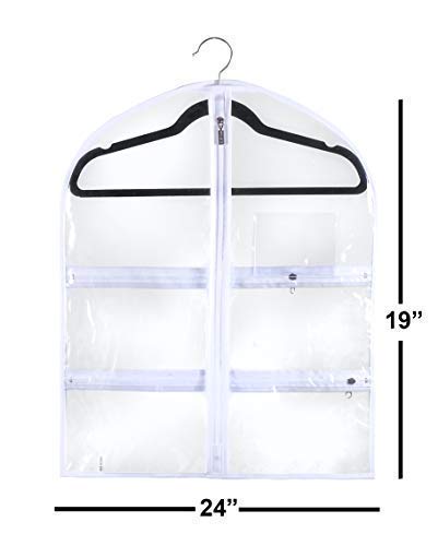 Multipurpose Hanging Garment Bag - Measures 19" x 24" These versatile clear garment bags are ideal for storing theater costumes, dance and ballet clothing, and dress or business wear.Convenient Accessory Pockets - Along with a main storage area for clothes each bag features three pockets for shoes, belts, headwear, socks, and other accessories.