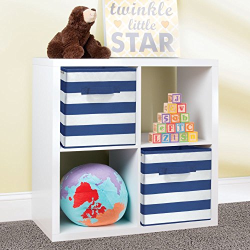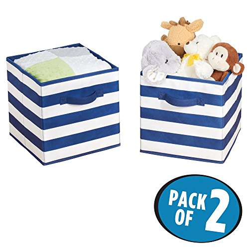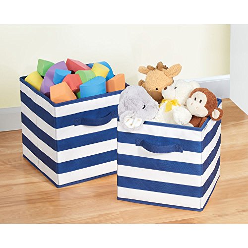 These two small ID jr Fabric Storage Cubes by InterDesign can help keep your child's closet, modular cubby spaces, play room or dresser tops neat and organized. Each offers ample space for storing shoes, clothing, blankets, linens, toys and other necessities. The front pull handle lets you grab it off a shelf with ease. Its rugby-inspired navy and white striped pattern offers a modern look to any bedroom closet or storage space.ORGANIZER CUBES- Two small cubes, each with a pull handle, help organize shoes, pajamas, blankets, baby clothes, toys, shoes, sweaters, pants and other necessities