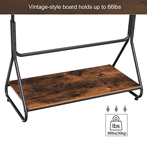 LASTS FOR YEARS: Excellent construction thanks to the rugged polished metal construction. Powder coated iron tubes with attractive MDF board. This can hold a great deal of weight without fear of breaking, bending, or leaning. Hanging rail holds 44 lb and bottom shelf holds 66 lb