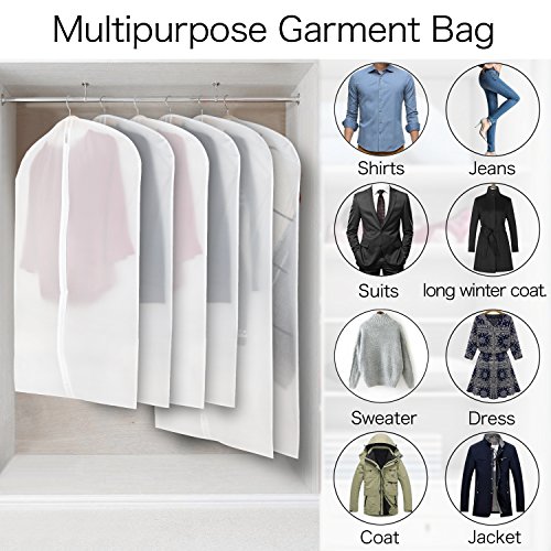 【Breathable Garment Bag】The Upgraded Version Hanging suit/garment bag are made of Soft PEVA material ,snag free and full length center sturdy zipper. 2 inches bigger than standard bag . Dust and water resistant, it can protect your clothing from mildew and pet hair, keeping them fresh and wrinkle free.